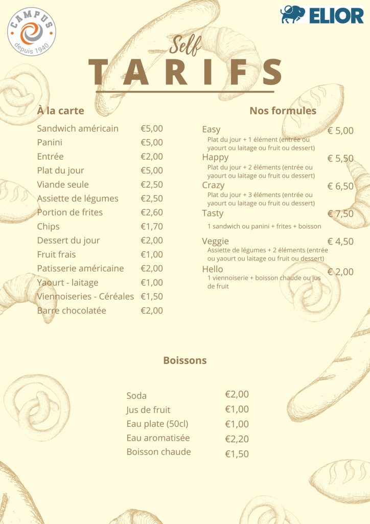 A partir de 11h15, les élèves peuvent se restaurer sous forme de libre-service : formules menu, sandwiches, panini, salades à emporter …. et des menus équilibrés